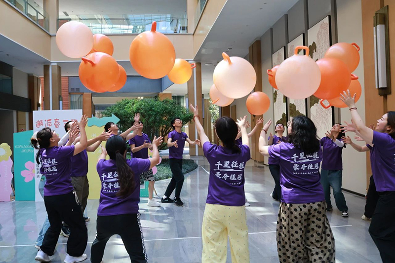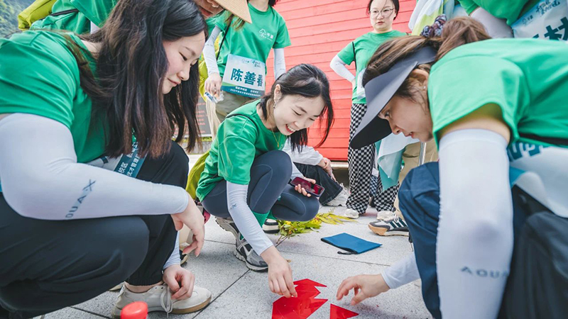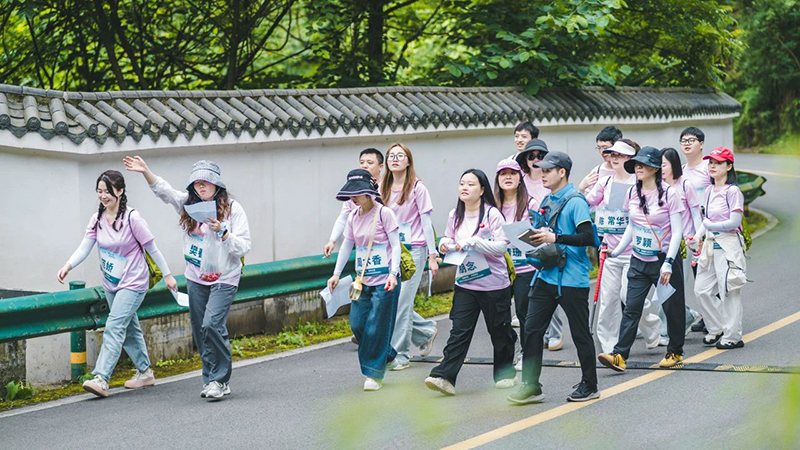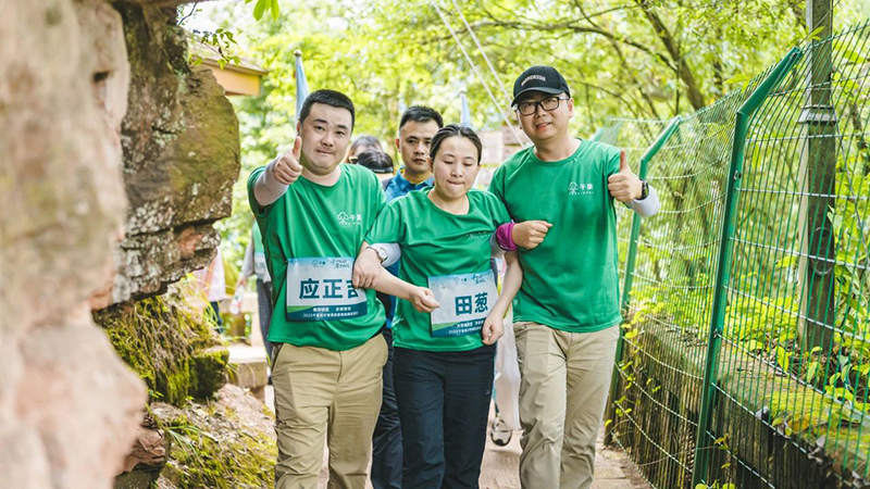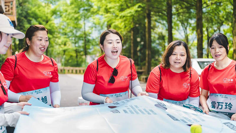 团队成员一边欣赏着古木参天、山花烂漫的自然画卷,一边全情投入协作游戏。