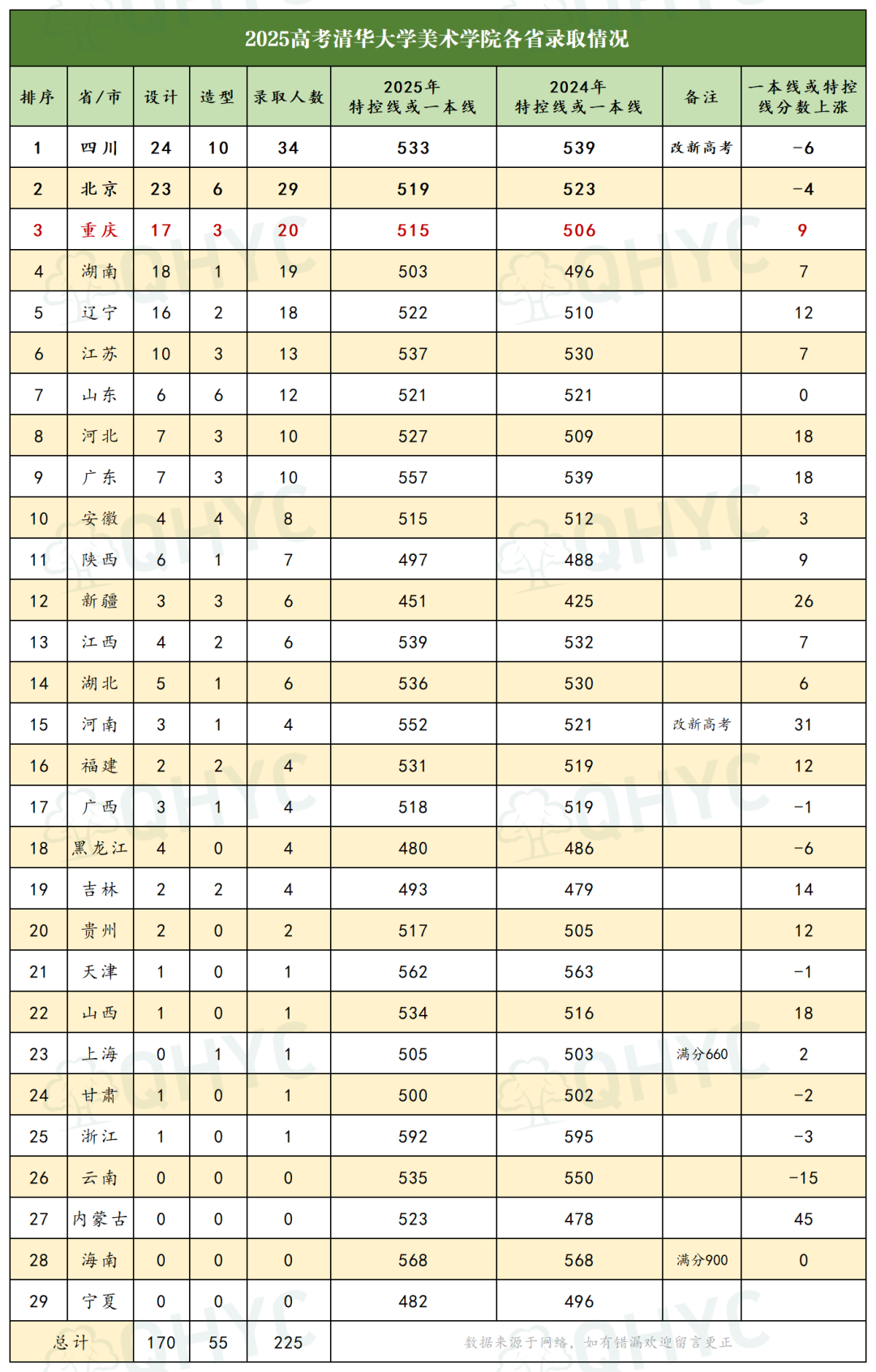 虽然重庆曾因地域长期重视美术教育(尤其几所高中聚集优质生源)而取得过辉煌*,但2025年清美录取数据的剧烈震荡,凸显了艺术院校招生政策调整对生源格局的重塑力量。美术升学道路竞争日益激烈(“愈发卷”),对文化课(需过达标线)和专业课(需排名)的要求都在不断提高。家长朋友们理性看待美术升学,关注政策变化,科学规划备考方向。