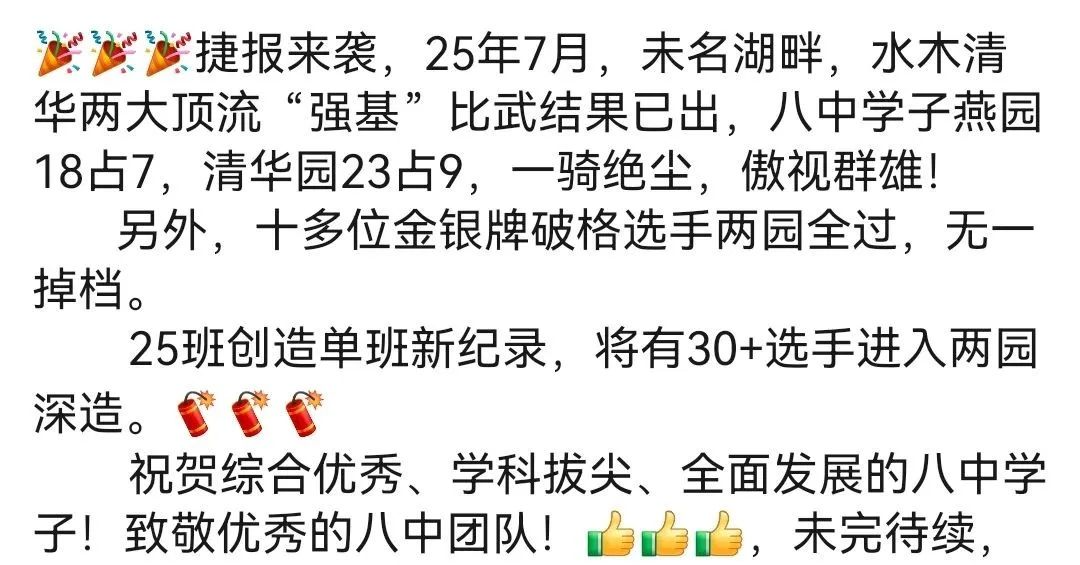 (2)物理类上北大医学线9人,清华飞行员线3人。历史类上清北线12人。高2025届7班(钱学森班)清北录取48人,其中北大20人,清华28人!全员985!附获奖情况:国际金1;亚洲金1;国集13;清北英才班各1;北大卓越2;清华攀登5;11人;清北强基13。预计2025年清北录取总人数将达到108人!