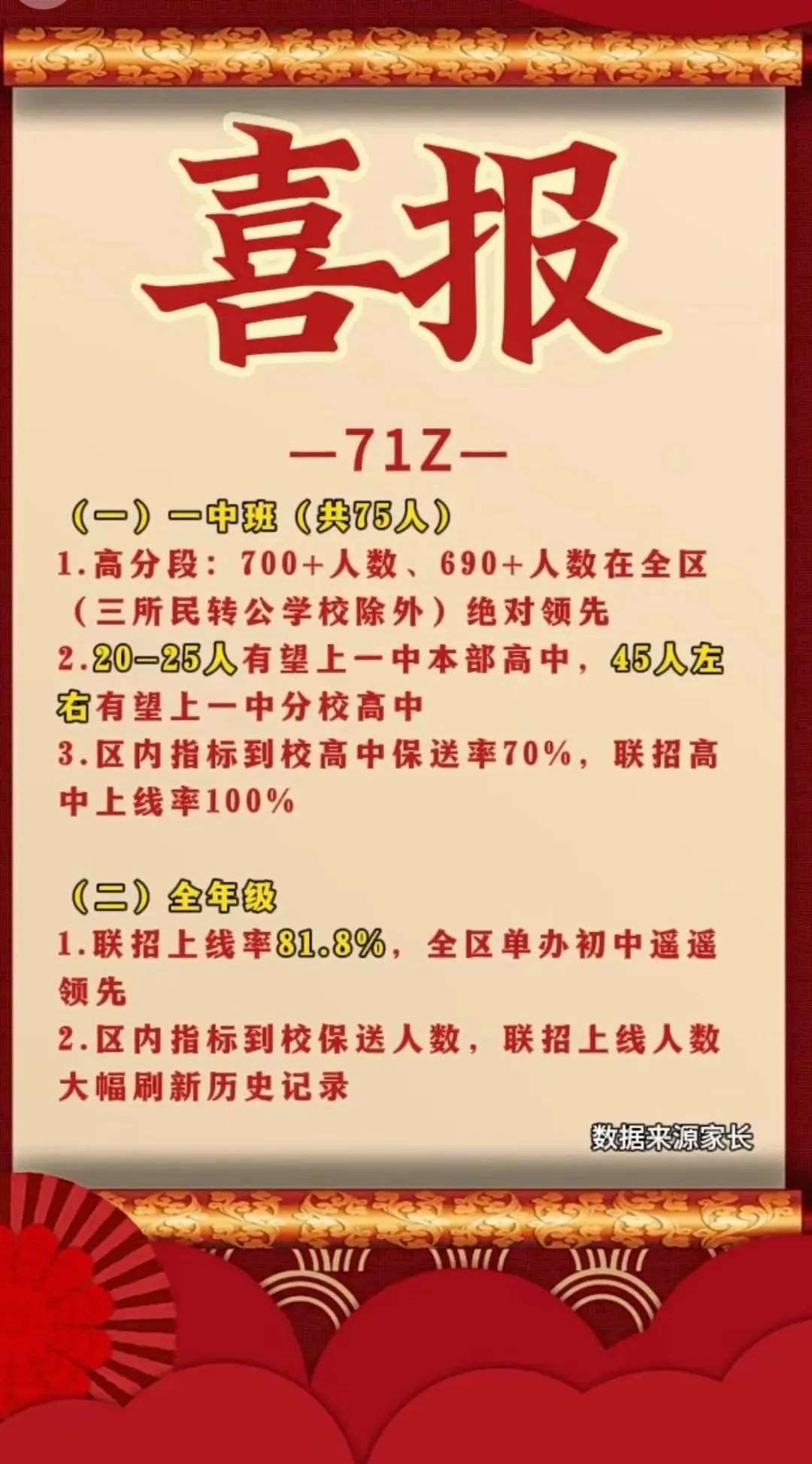 2️⃣初三首届一中班(67人),联招学生全部上线,联招上线率,680以上高分段人数及比例,同类学校!上七龙珠线以及被一中(含一中分校)录取40人!