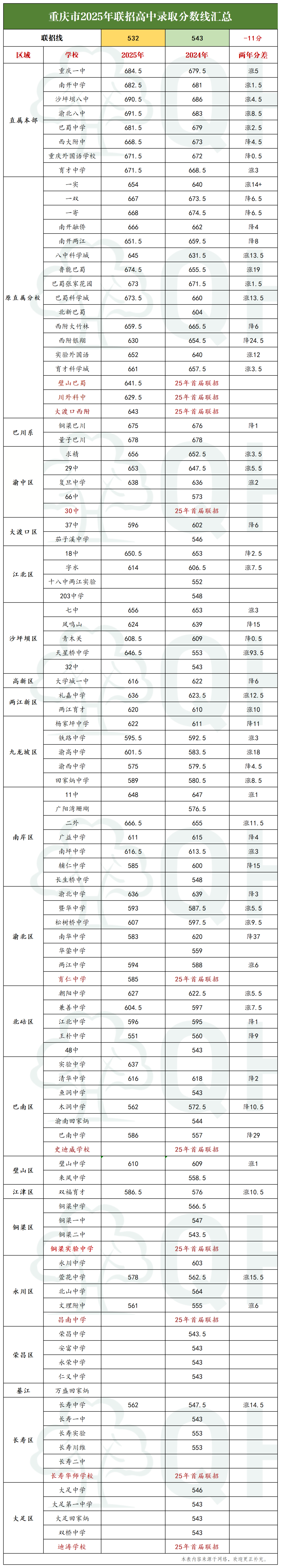 据悉,重庆七大直属本部高中2025年的录取分数线是——