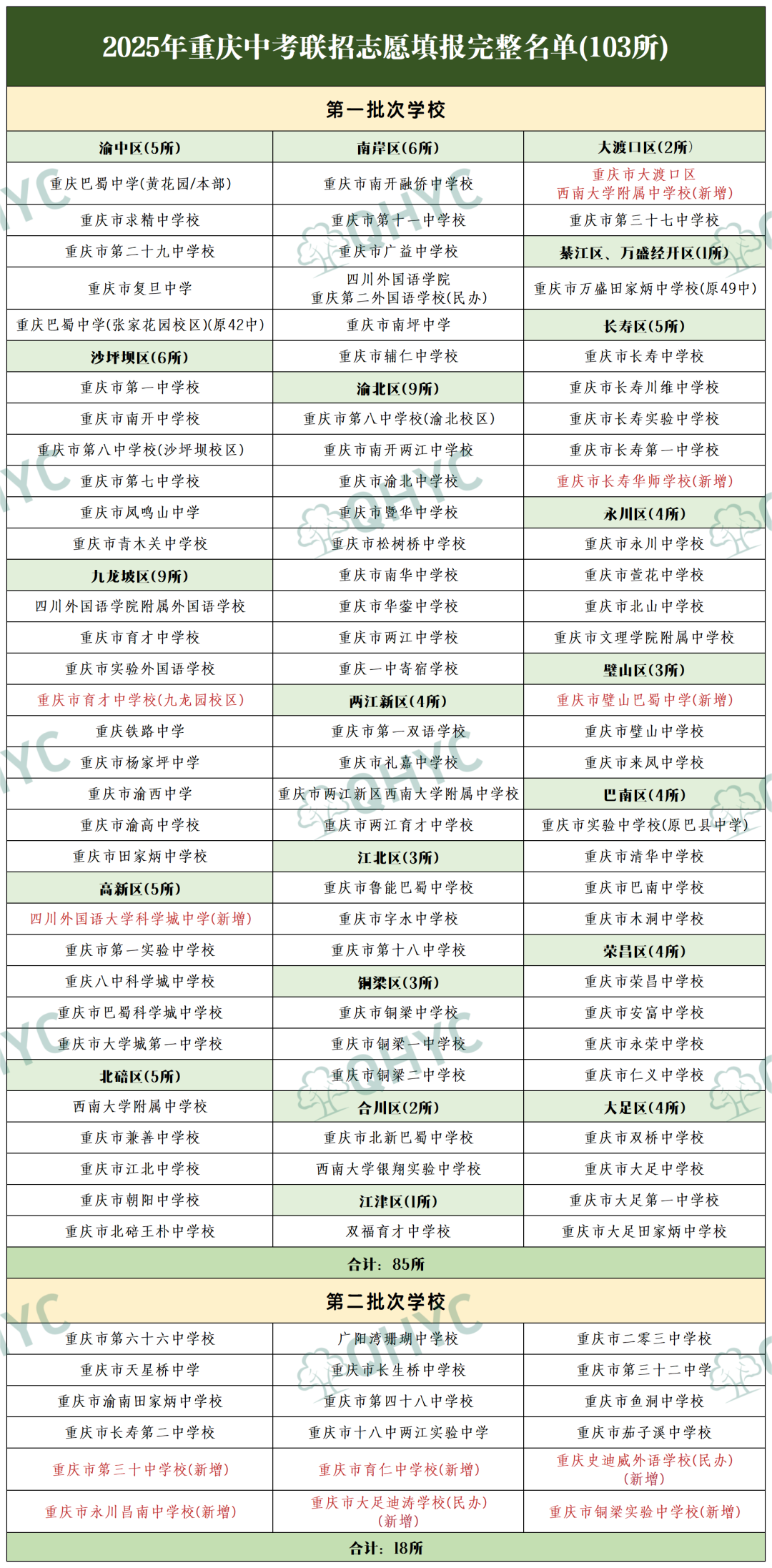 2025年重庆中考联招志愿预填报通道即将关闭!因为今年全市联招高中阵容迎来重大变化——新增10所招生学校,总数达到103所!面对更多选择与更复杂的志愿填报,如何把握新增校机遇?哪些学校更适合自家孩子?很多家长都在纠结,希望豪豪老师这份联招校名单与择校指南能帮上你!