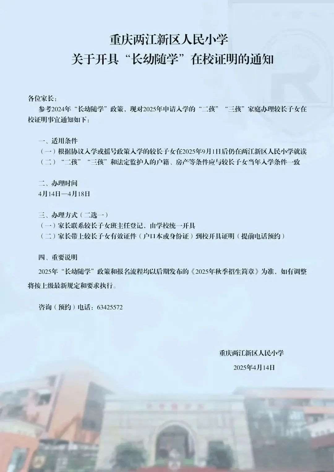 2025年政策原文:为方便多孩家庭接送,减轻家长负担,各区县要结合实际制定本地“长幼随学”实施方案,优先满足同一学校随学需求。具体实施办法家长可致电所在区县教委咨询了解。