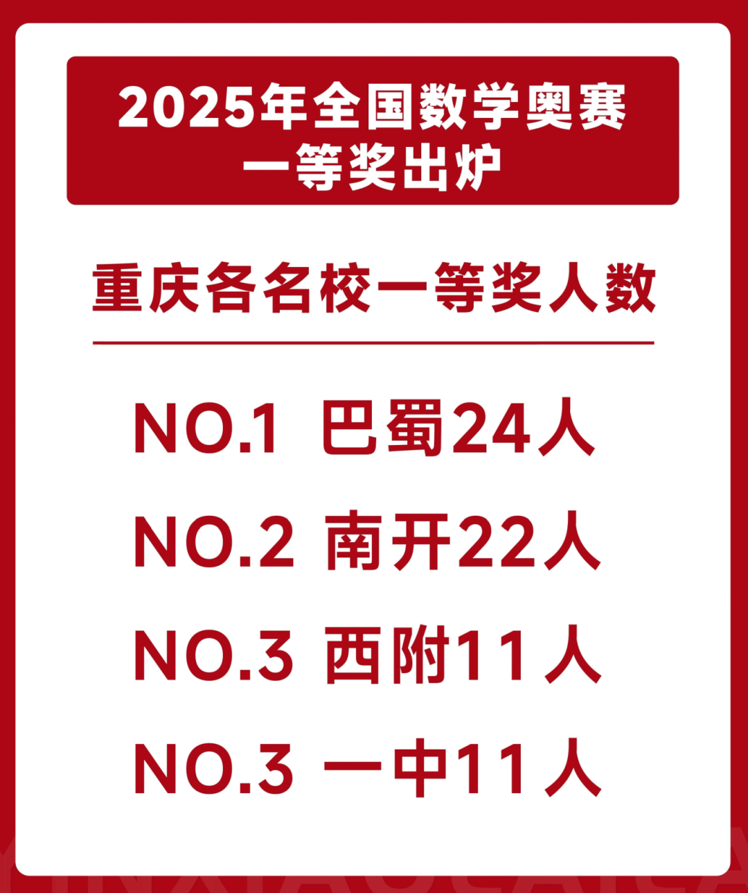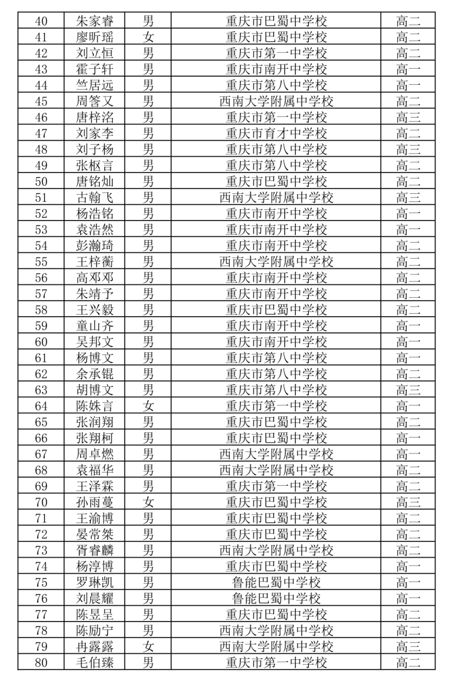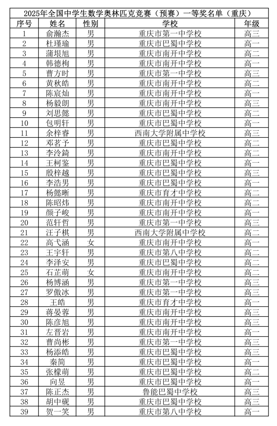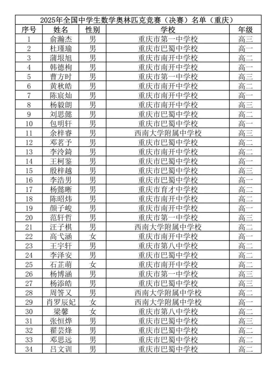 对比去年,今年省队规模再扩容,较2024年的28人增加6人,展现出重庆数学竞赛实力的持续提升。